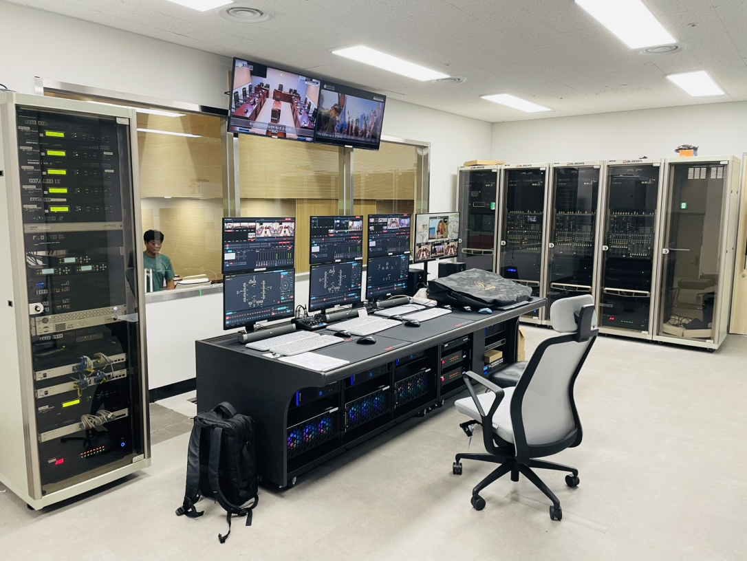 A. 신규 NDI 네트워크 영상 기반의 세계 최신 기술로 발언자 자동 탐색, 원격 제어 연결 IOT 기기 통합 제어 현재 1인이 통제 운영해야되는 인력 조직이어서 각 회의실에서 쌍방향 운영 제어의 협조를 받을 수 있도록, 회의실과 통합 방송 제어실에서 모니터링하고원격 제어할 수 있습니다. 발언자 화자 자동 추적 제어 시스템으로 회의 패턴에 따라 시나리오 형태로 자동 운영되도록 하여 최소 1인이 운영될 수 있도록 구현하였습니다. 적은 공간에 소규모 인력을 통한 효율적 운영 가능