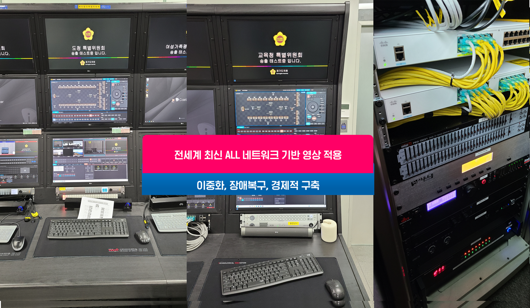 기존 전통적인 방식이 아닌 전세계 최신 기술은 방송/프로AV의 주류가 ‘비디오 오버 IP’로 이동 중입니다. 표준 이더넷망에서 고품질·프레임 정확도·저지연 전송을 제공하고, 사실상 국제적 “현장 표준”으로 확장되고 있습니다. 이번 국내 최대 의회, 최대 동시 생방송을 하는 경기도의회에 적용되어 경제성, 빠른복구, 적은 공간 활용, 노이즈 없는 고품질 구축