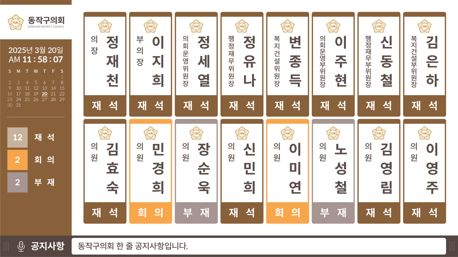 "서울시 동작구의회 개청과 함께 실시간 중계 및 전자문서회의 구축”, 의원실 실시간 재부재 솔루션을 의회 신청사의 구조에 맞게 구축하였습니다. 현재 자체 영상회의록과 대민 유투브 실시간 중계를 동시해 서비스하여 함께 하는 디지털 의정을 구축하였습니다.