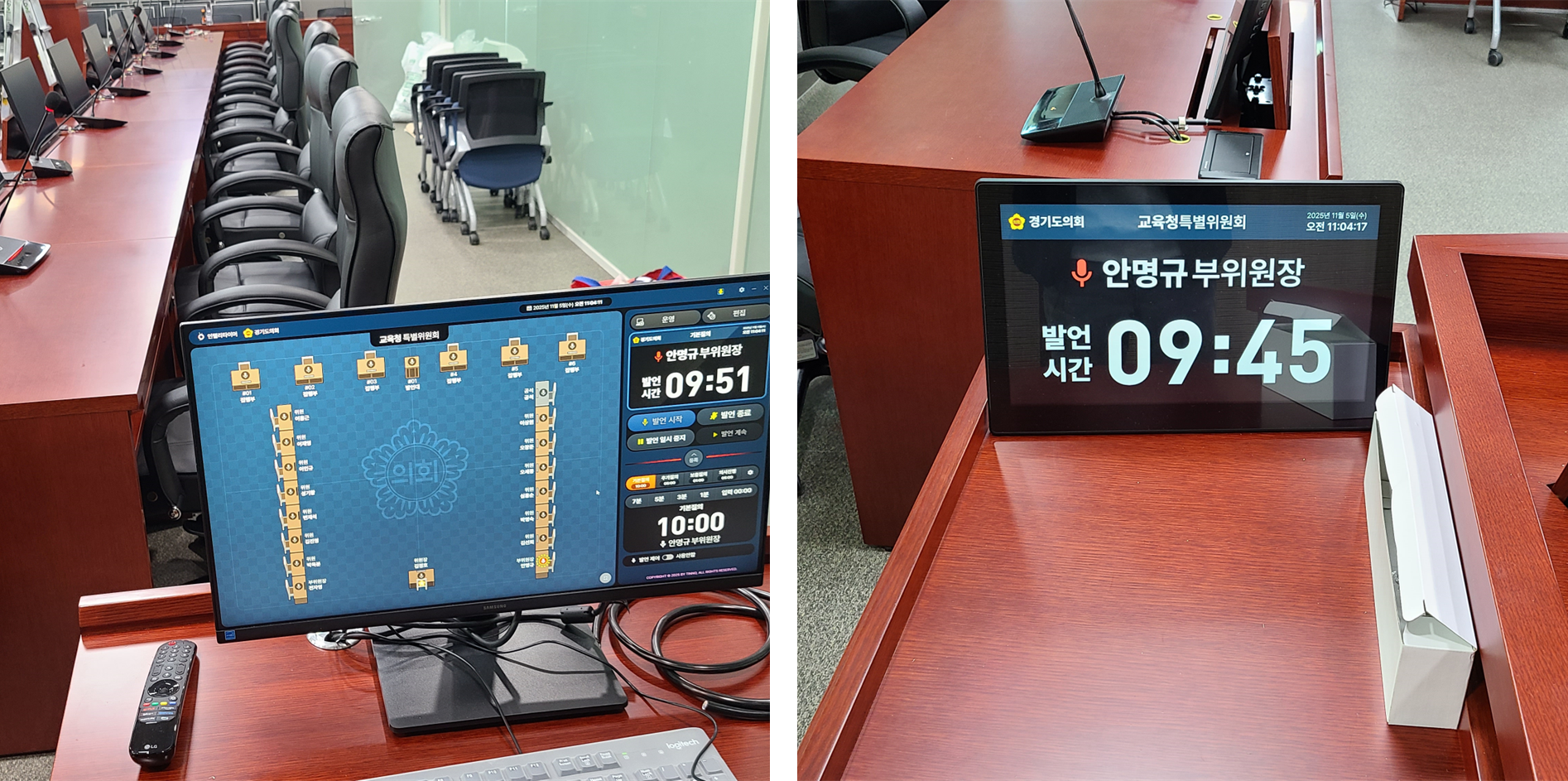 A. 경기도의회 기존 보유중인 디지털 회의 시스템을 연동하여 정해진 발언시간을 준수하기 위해, 세팅된 시간에 따라 마이크를 자동으로 OFF 하여 발언시간을 제어, 추가시간, 재석 표출 등 다양한 기능을 제공합니다.